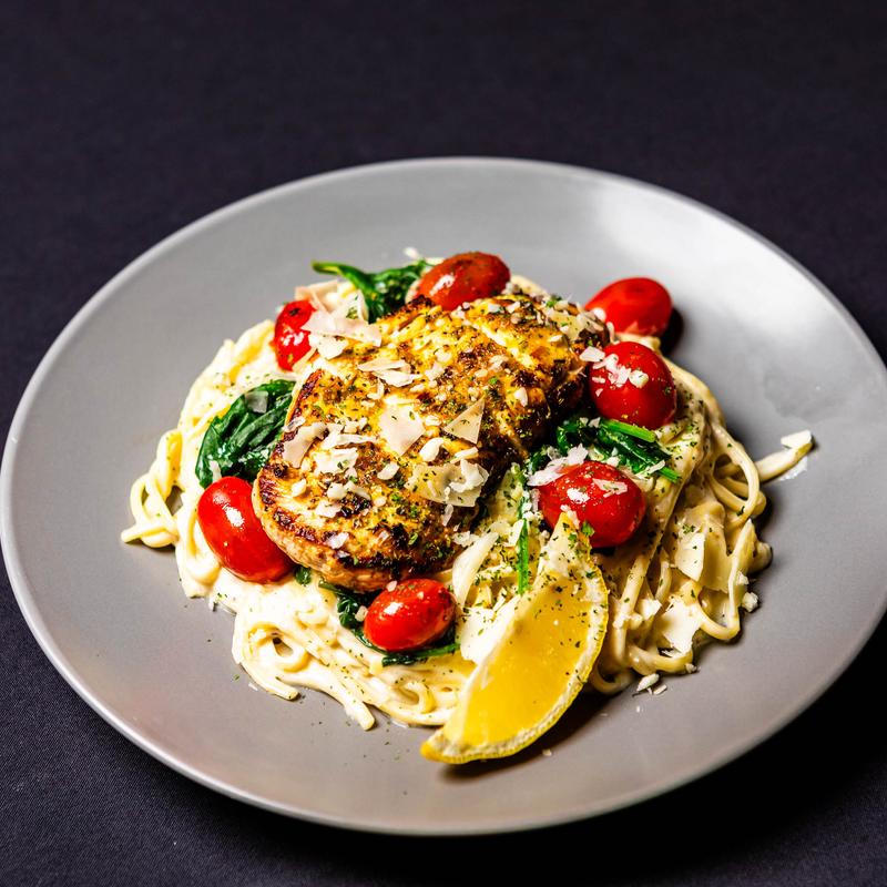 Seared chicken breast, garlic parmesan cream sauce, grape tomatoes and spinach on linguine pasta