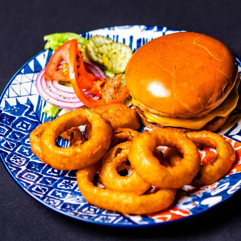 Bison patty with choice of cheese, lettuce, tomatoes, pickles, & onion on a toasted bun